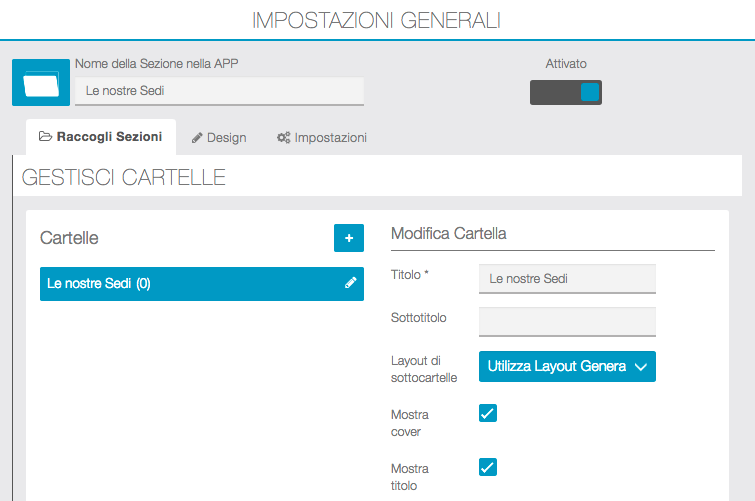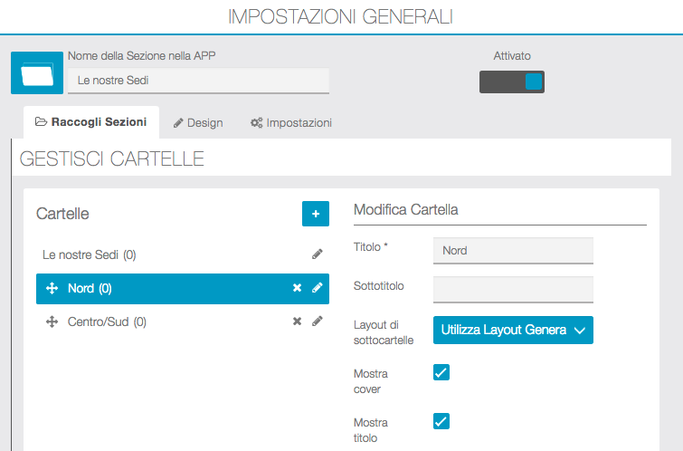1 – Per iniziare assegnare al raccoglitore un titolo e un sottotitolo. Con il layout di sottocartelle è possibile scegliere la disposizione delle eventuali sottocartelle all’interno della APP (tab Design). Per creare una sottocartella è necessario cliccare sul simbolo + mentre, per modificare nome sottotitolo o immagini è sufficiente cliccare sul simbolo della matitina.