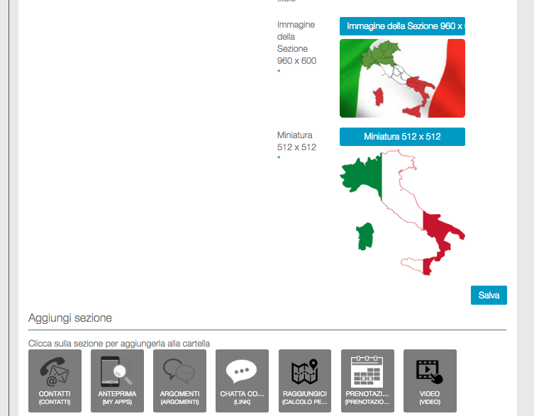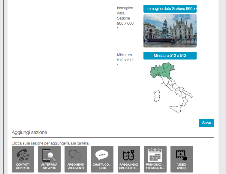 4 – Una volta create le cartelle è possibile inserire le sezioni (già sviluppate precedentemente) per ciascuna di esse cliccando sulla sezione stessa (nel campo in basso “Aggiungi Sezione”) che automaticamente si evidenzierà nel task in alto “Sezioni Inserite”.