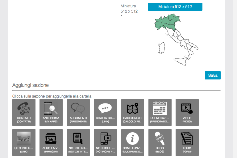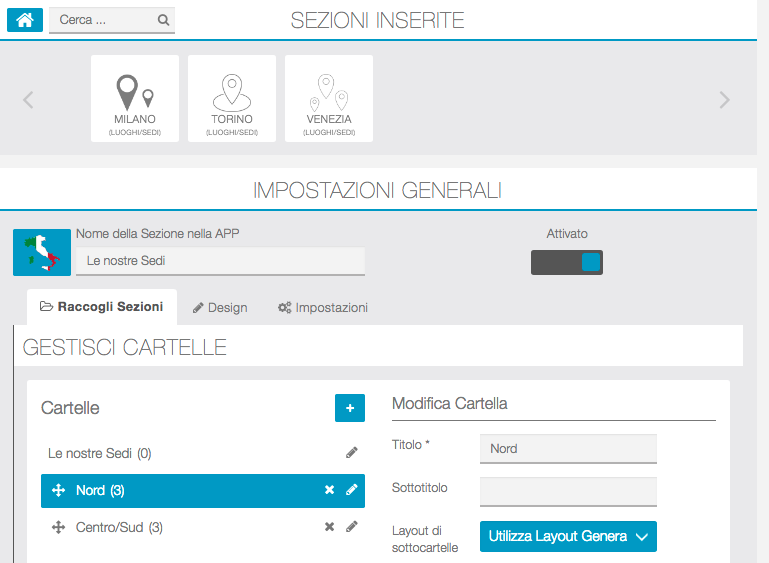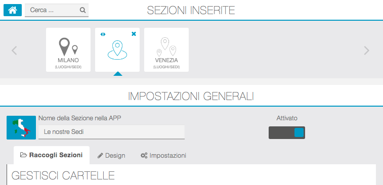 5 – Per modificare una sezione inserita è sufficiente cliccare su di essa; per rimuoverla dalla cartella (e riportarla nel menu generale dell’app) o per modificarne l’ordine di visualizzazione, portare il cursore del mouse sulla sezione e cliccare sulla X (primo caso) oppure sulle freccette (nel secondo caso).