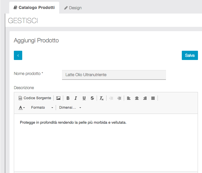 Cliccando infine su SALVA, in alto a destra, il prodotto inserito viene memorizzato.