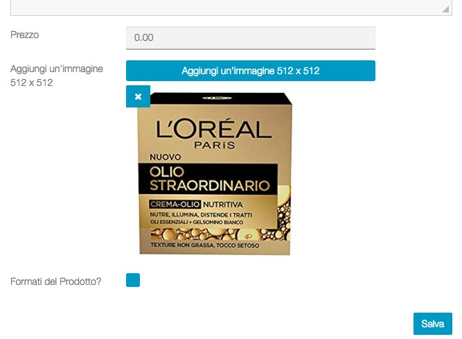Con il tasto “Aggiungi un’immagine” si può assegnare una foto al prodotto inserito.