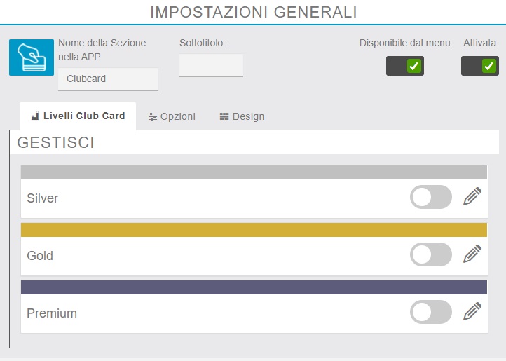 Il modulo Club Card renderà possibile la creazione di una tessera associato multilivello: ottenendo punti nelle Carte Fedeltà inserite in APP, l’utente salirà di livello e sbloccherà diversi benefici.