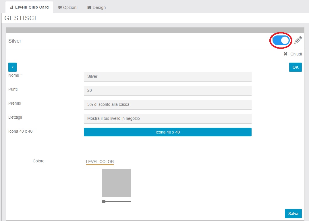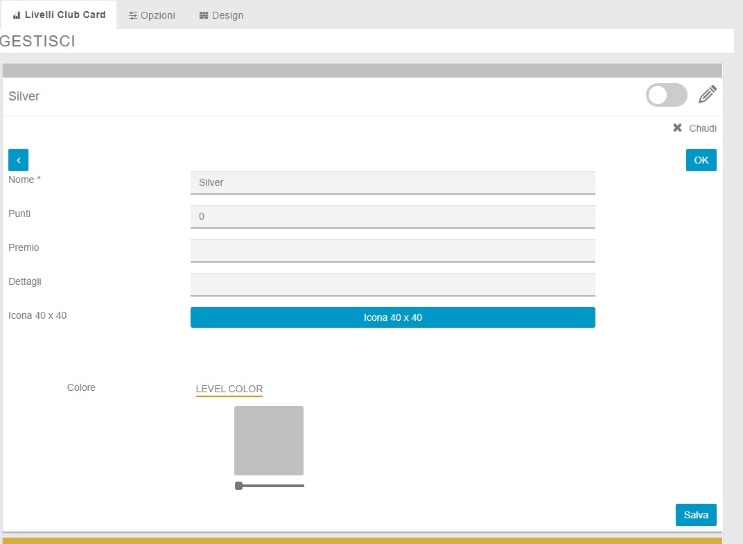Nel campo Punti bisogna impostare il numero di punti che l’utente deve raggiungere per sbloccare questo livello di fedeltà. Ogni livello avrà un traguardo di punti differente.
