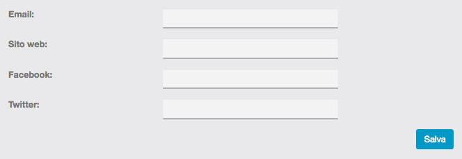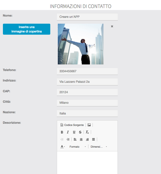 1 – Compilare i campi di contatto da visualizzare… è possibile anche inserire una immagine di copertina (logo, immagine del team, foto della sede ecc.)… possibile inserire anche i contatti “social”.