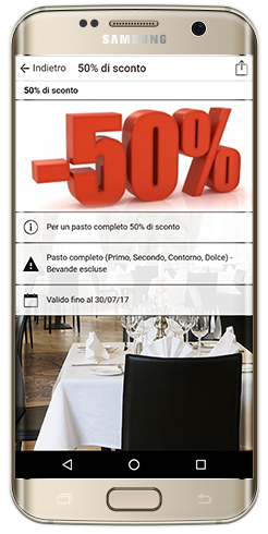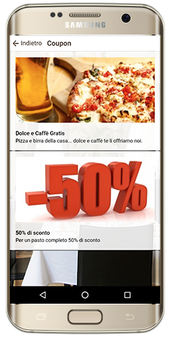 Nel nostro esempio abbiamo pensato ad un ristorante che utilizza i coupon per promuovere la fidelizzazione dei clienti e magari per “fare assaggiare” nuovi piatti e nuove pietanze… abbiamo predisposto due tipi di coupon… uno con sconto 50% (come per esempio Groupon) e l’altro di incentivazione fissa (dolce e caffè offerto per pizza e birra media)… queste promozioni ovviamente saranno riservate SOLO ai possessori della APP che presentano il coupon.