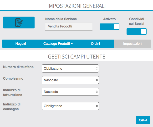 10 – Nel tab “Impostazioni” si inseriscono tutte le impostazioni generali della APP… il primo punto da specificare è relativo ai “campi utente” e si può decidere per ciascuno di essi se vogliamo far vedere il campo, se vogliamo renderlo obbligatorio e se preferiamo nasconderlo.