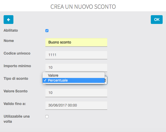 11 – Si possono anche creare degli “sconti” che verranno utilizzati dagli addetti in abbinata per esempio ai coupon COUPON… si deve assegnare un “codice univoco”, un eventuale “importo minimo” entro il quale non vale lo sconto, un “tipo di sconto” che può essere un valore assoluto o una percentuale e la “validità” (fino a…); attivare la casella “utilizzabile una sola volta” se il codice non è ripetitivo; dopo il primo utilizzo non sarà più valido.