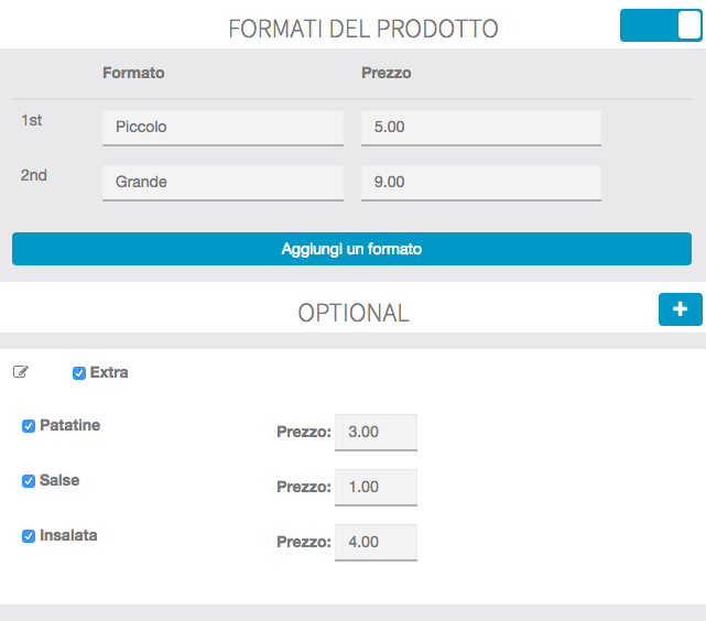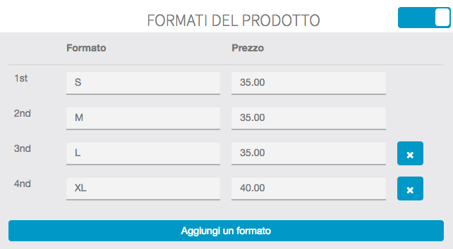 si inseriscono anche i prezzi per ciascun formato (esempio: prodotto olio extra vergine prezzo al litro 20€… formati: 0,5 lt prezzo 12€, 1 lt prezzo 20€ e 5 lt prezzo 80€)