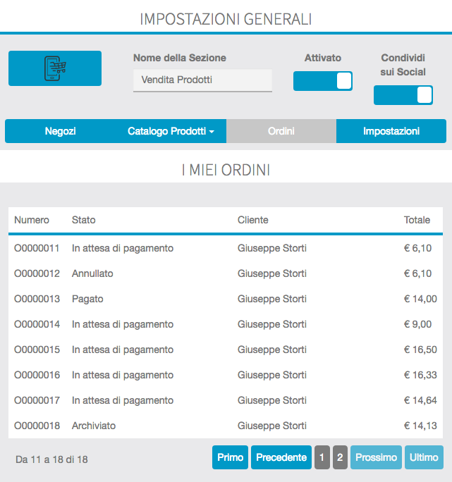 8 – Nel tab “ordini” si trovano gli ordini inseriti dai clienti attraverso la APP… Vengono elencati: – “Numero d’ordine” (generato in automatico dal sistema) – “Stato dell’ordine” (modificabile e può essere -In attesa di pagamento- -Annullato- -Pagato- -Archiviato- gli stati sono gestiti dal proprietario… vedi punto 9) – “Cliente” – “Valore Totale dell’ordine” … cliccando sul nome del campo si può cambiare il sistema di ordinamento.