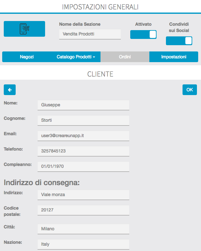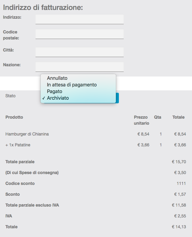9 – La visualizzazione dell’ordine riporta tutti i dati inseriti. Si può modificare Lo “stato dell’ordine” attraverso l’apposito menù a tendina.