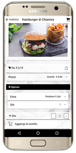 Nell’esempio che riportiamo si tratta di un ristorante che offre servizi di consegna di panini con Hamburger… possono essere acquistati 2 tipi di panino: piccolo e grande (formati del prodotto) e in aggiunta inseriti degli optional come patatine o salse… gli optional possono avere la quantità variabile in funzione del gusto del cliente… posso ordinare un panino grande con 2 porzioni di patatine (ho fame 🙂 ).