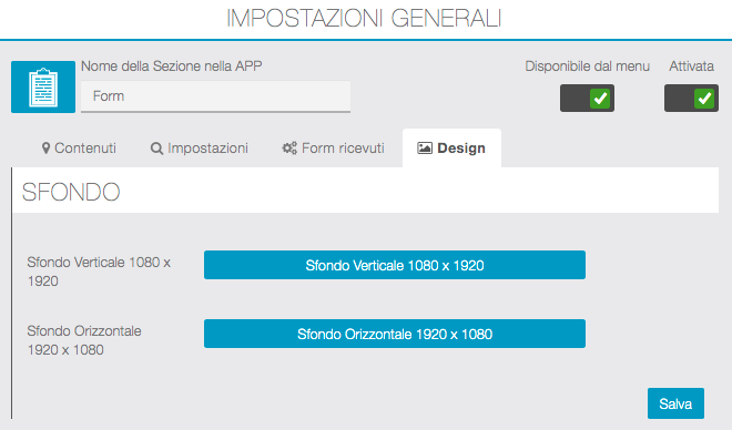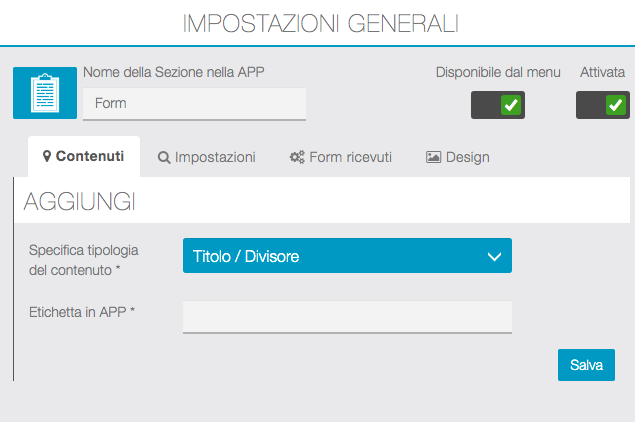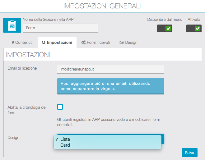 Contenuti – Impostazioni – Form ricevuti – Design
