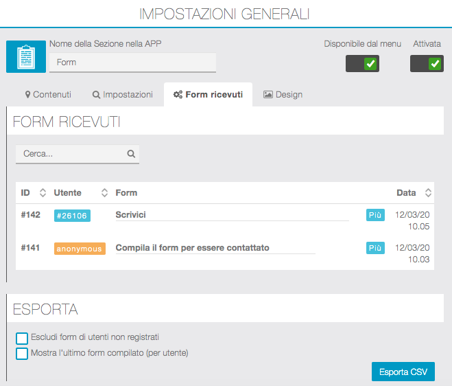 Inoltre, è possibile distinguere i form compilati degli utenti registrati in APP dai form delle persone non registrate.
