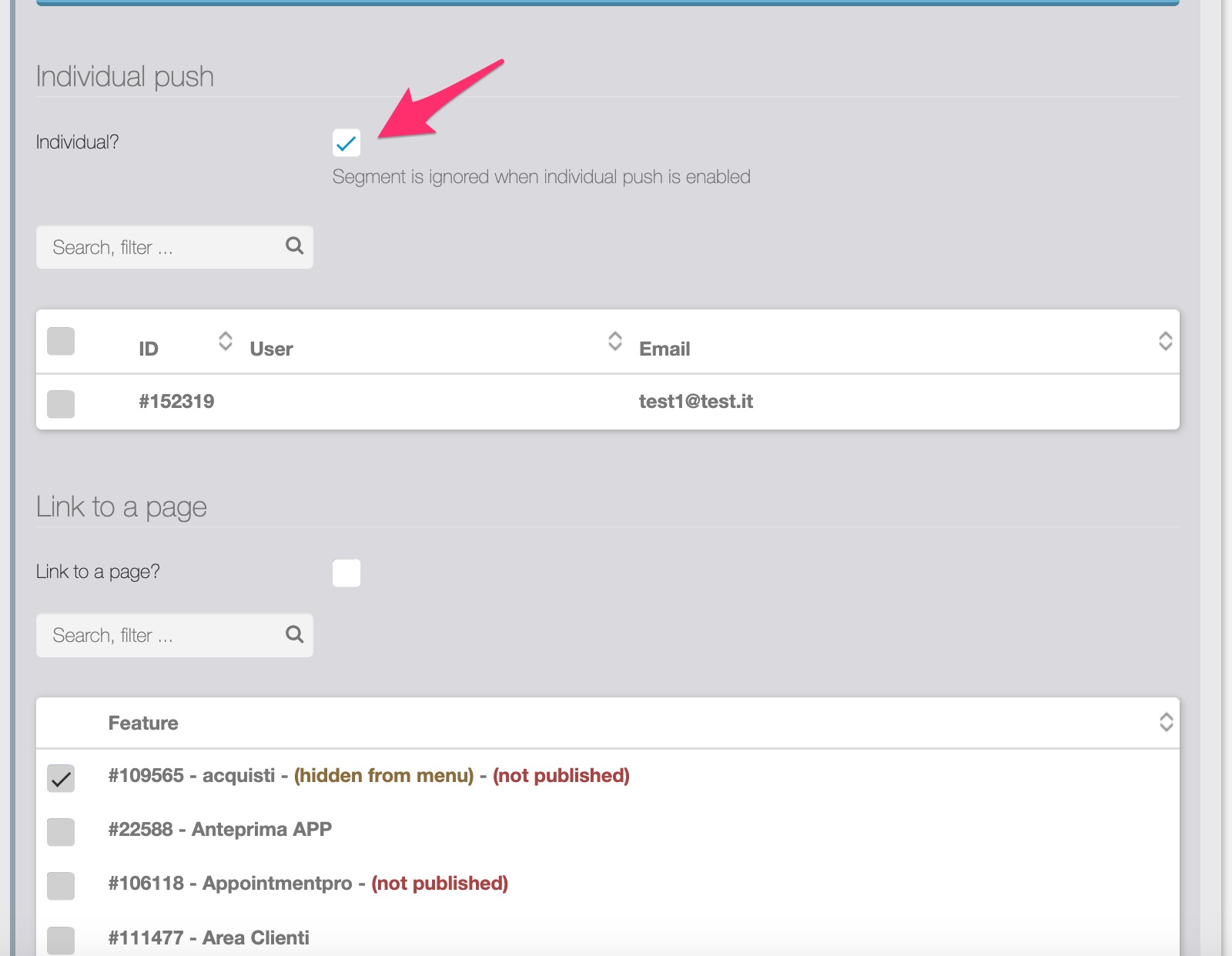 Selezionando la voce Individual? con la checkbox accanto, si potrà decidere di inviare la notifica a un utente specifico. Apparirà quindi la lista degli utenti registrati nell’APP dalla quale si potrà selezionare l’utente (o gli utenti) a cui inviare individualmente la notifica.