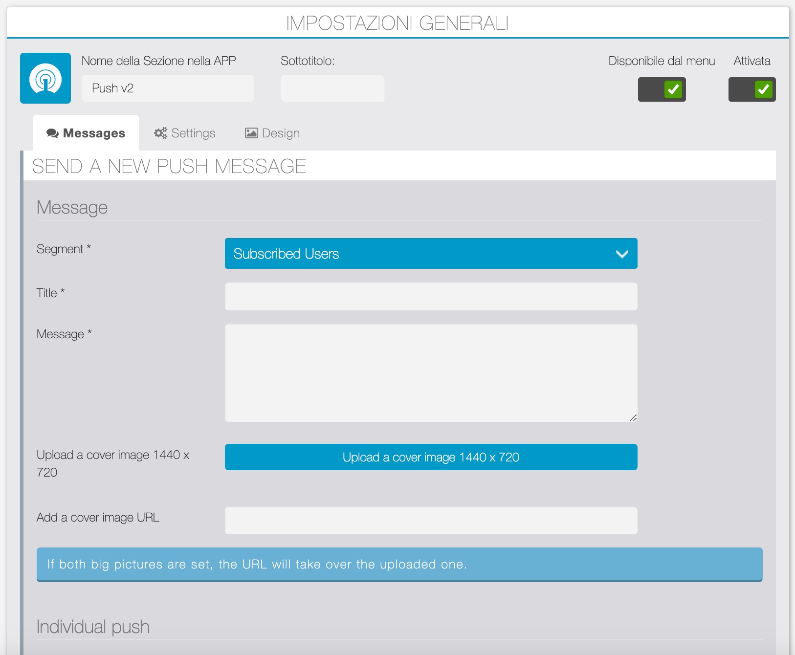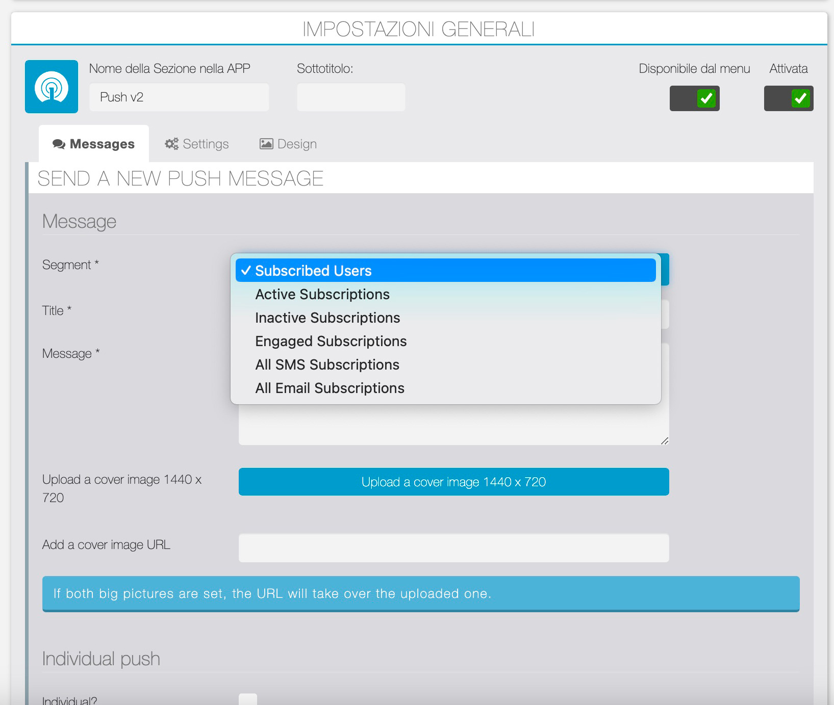 1 – Entrando nelle impostazioni della sezione “Notifiche Push” si aprirà questo menù.