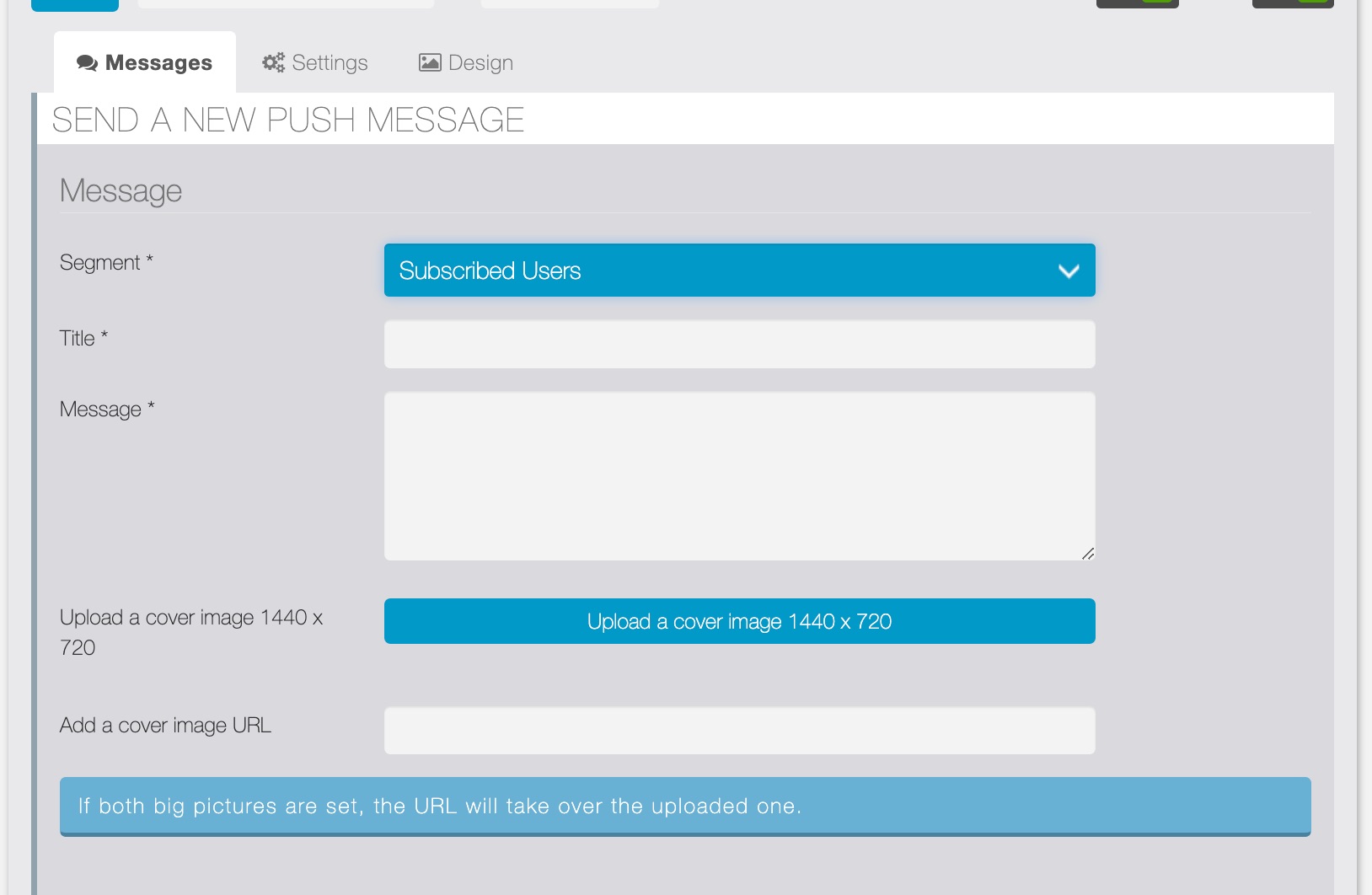 Upload a cover image permette di inserire un’immagine che verrà visualizzata come foto di copertina della notifica; accanto ci sono le indicazioni riguardo le dimensioni consigliate del file in pixel.