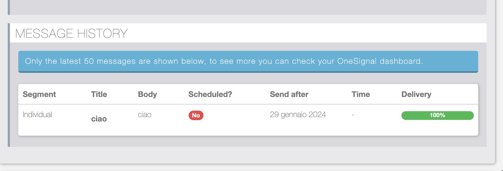 L’ultima sezione contiene lo storico delle notifiche push inviate, con anche una serie di informazioni sulle statistiche di ricezione.
