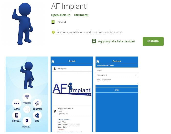 L’APP AF SRL ti dà l’opportunità di prenotare interventi su caldaie, condizionatori, impianti elettrici e termoidraulici. Lo scopo è di dare un servizio sempre all’avanguardia e diretto, accorciando anche le tempistiche di gestione pratiche. Con l’APP AF SRL si vuole fare in modo che l’utente finale abbia un riscontro immediato.