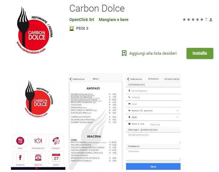 App ideata e realizzata per poter dare l’opportunità agli ospiti del carbondolce di consultare il menù sul proprio dispositivo, prenotare un tavolo, ricevere offerte e rimanere aggiornati sugli eventi del locale.