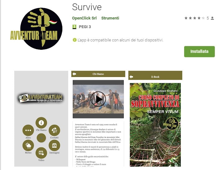 Survive fornisce un piccolo manuale scritto dal fondatore della Accademia nazionale di sopravvivenza AICS/CONI. Visualizza la posizione geolocalizzata per orientarsi con sicurezza. L’applicazione è ideale per conoscere le tecniche per realizzare un bivacco, un letto di emergenza; le medicine più utili per aiutare sé e i membri del gruppo. Nella sezione dedicata, sono visualizzabili le foto, i video e i tutorial per imparare e per divertirsi. Vi sono inoltre le informazioni meteo, i link delle scuole di sopravvivenza, le modalità per iscriversi ai corsi, i profili facebook dei professionisti del settore e i numeri utili per chiamare soccorsi.