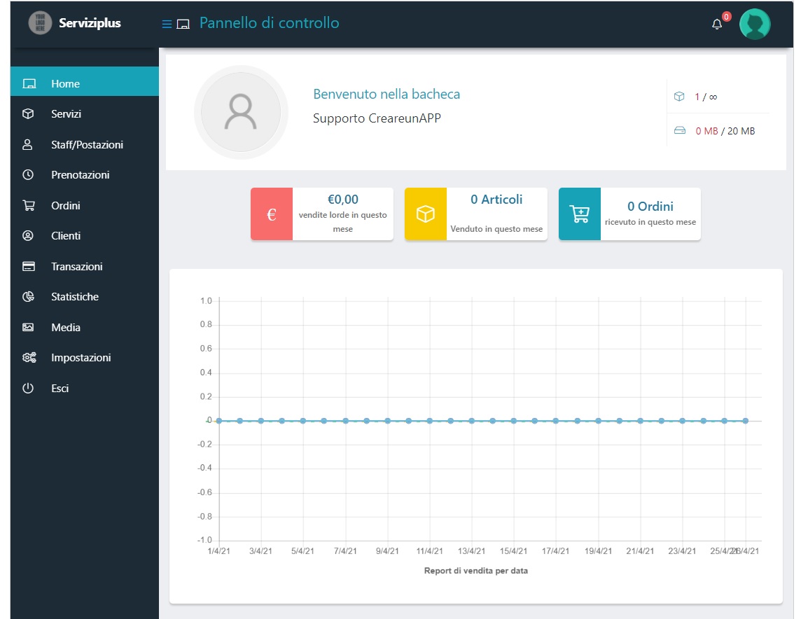 Dal menù laterale di sinistra, si può accedere a tutte le funzioni per gestire le prenotazioni, lo Staff/Postazioni, gli ordini, i clienti registrati, le transazioni effettuate e per poter modificare le impostazioni della propria attività.