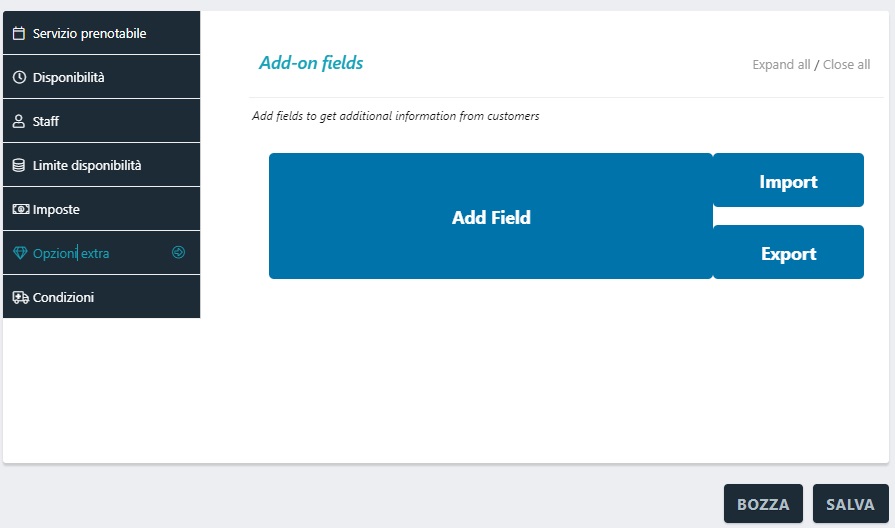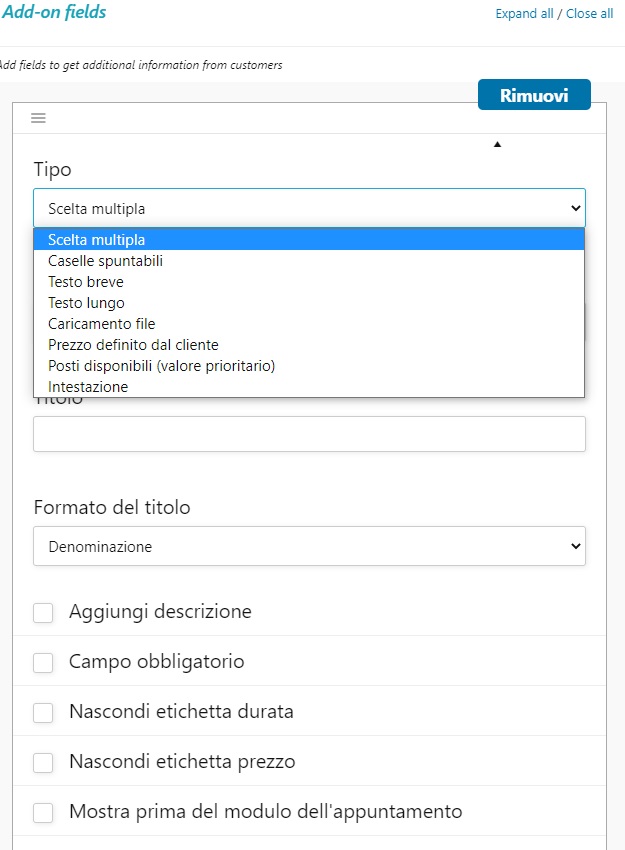 Sotto Tipo troveremo una serie di opzioni per definire il campo che vogliamo aggiungere. Possiamo aggiungere delle opzioni di scelta multipla, delle caselle spuntabili per offrire scelte personalizzate al cliente, un campo di testo da far compilare al prenotante. C’è anche la possibilità di far caricare al cliente un file, opzione utile in caso ci sia la necessità di richiedere documenti particolari di chi effettua la prenotazione. Ciascuna di queste tipologie presenta proprie opzioni di personalizzazione.