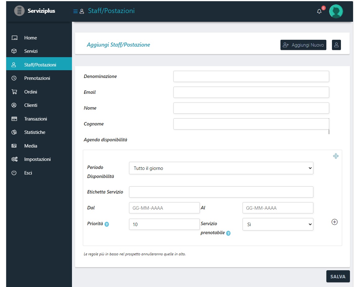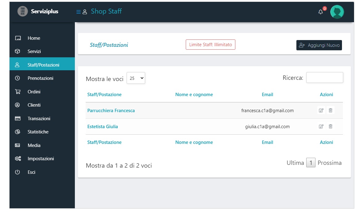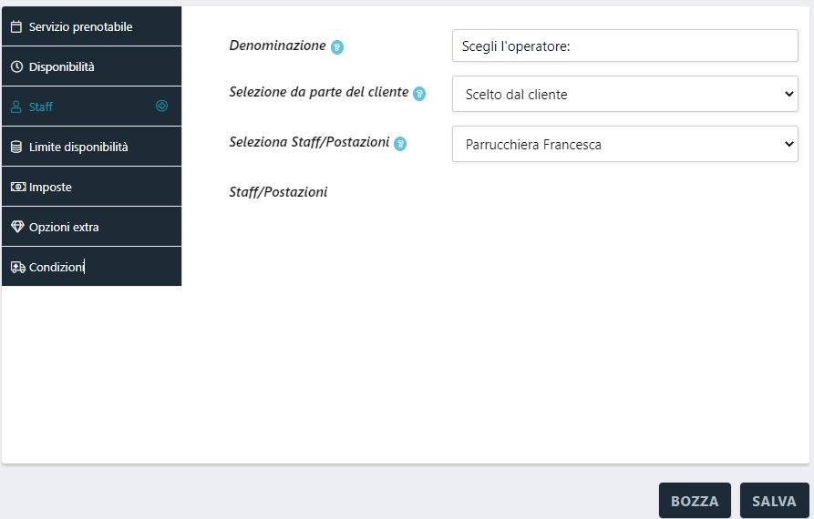 Sotto Staff/Postazioni compariranno i membri dello staff selezionati e associati al servizio.