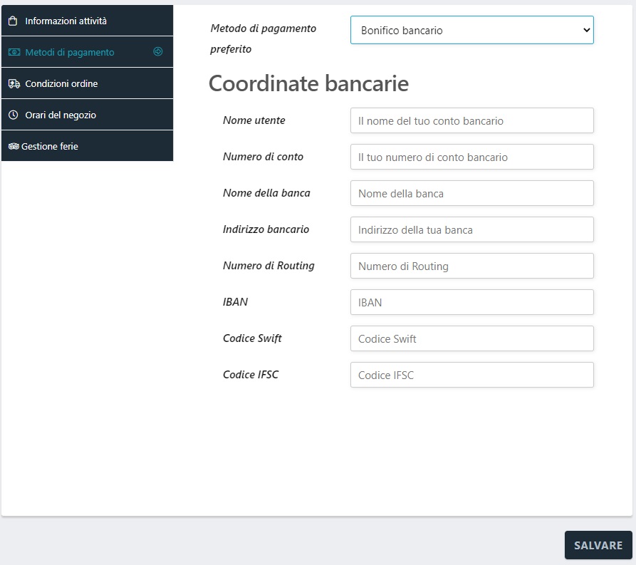 Per impostare il pagamento tramite Bonifico Bancario, basta compilare i campi richiesti con le informazioni del proprio conto e poi salvare.