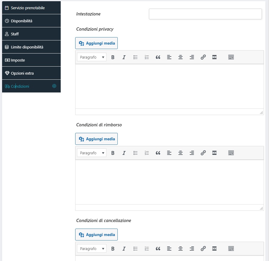 La scheda Condizioni presenta tre box di testo nei quali si potranno inserire le politiche di Privacy, di rimborso e di cancellazioni applicate al nostro servizio. Questa è una sezione informativa che il cliente potrà consultare dalla pagina della prenotazione.