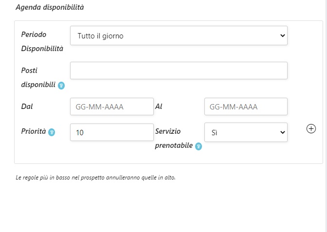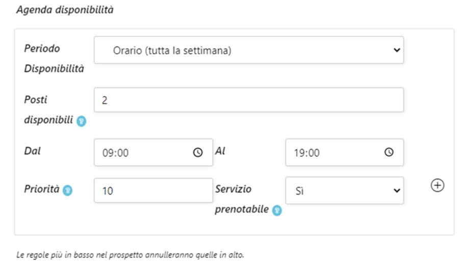 La parte successiva della pagina è composta da schede identiche a quelle presenti nel menù d’impostazione della disponibilità degli operatori dello Staff. Con il tasto + in basso a destra si potranno aggiungere ulteriori schede per rifinire al meglio la disponibilità del servizio.