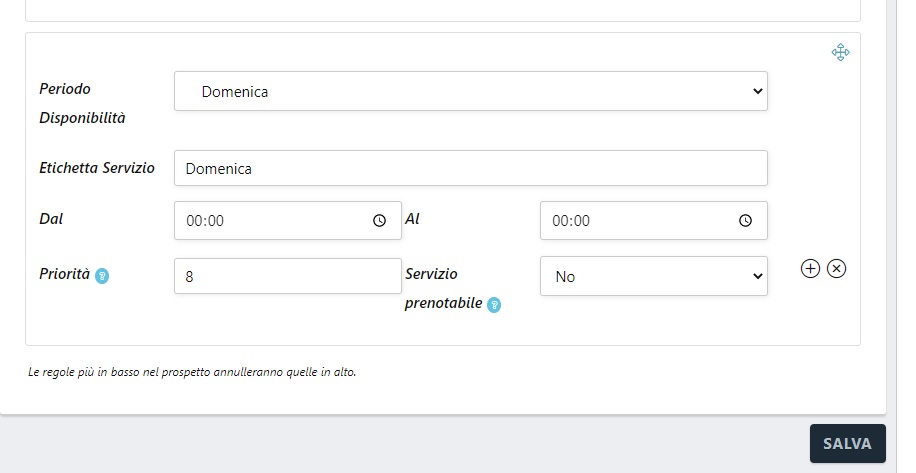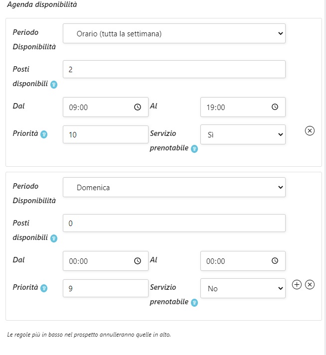 Aggiungendo una ulteriore scheda, si può definire che la domenica ci sono 0 posti disponibili e che per tutta la giornata il servizio non è prenotabile. Questa nuova regola aggiunge, in sostanza, un giorno di chiusura durante il quale il servizio non sarà disponibile ai clienti prenotanti.