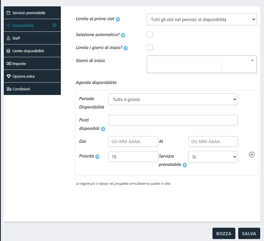 La scheda Disponibilità contiene gli strumenti per impostare la disponibilità orario del servizio.
