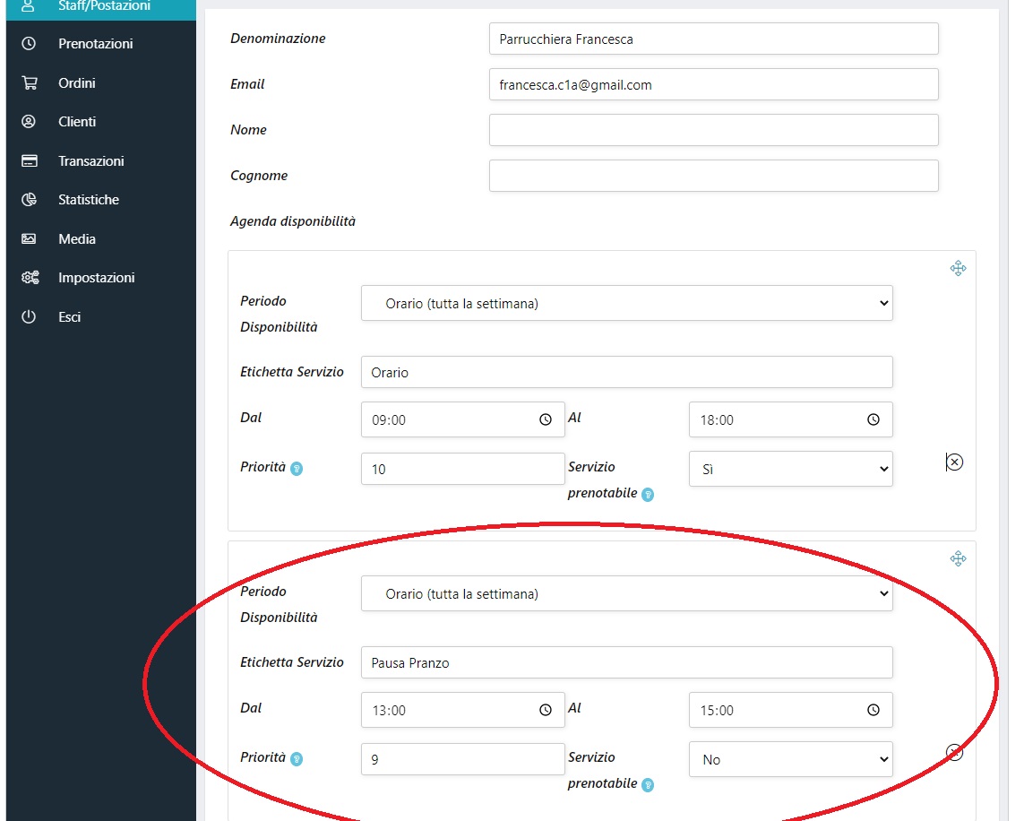 Ha anche però una pausa tutti i giorni, quindi nella scheda posta in seconda posizione è stato impostato che dalle 13:00 alle 15:00, tutta la settimana, il servizio a lei associato non sarà prenotabile.