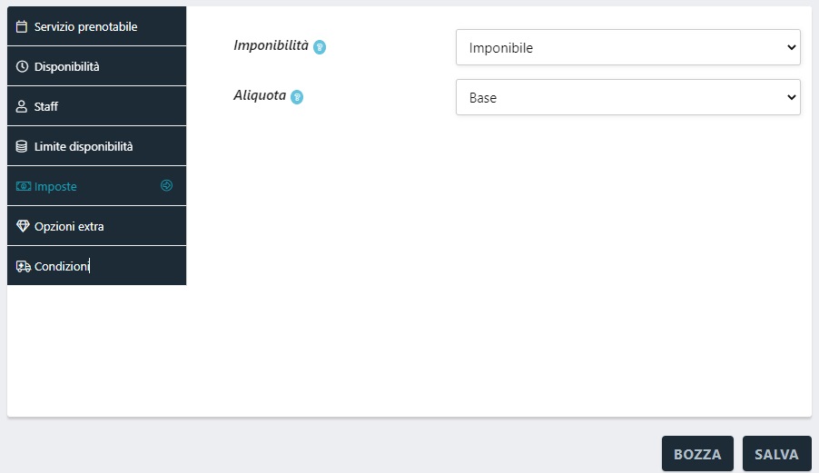 La scheda Imposte serve per gestire le tassazioni e la tipologia di aliquota che sarà applicata al prezzo del servizio.