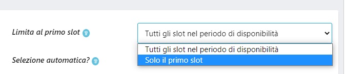 Limita al primo slot è seguito da un menù a tendina dal quale potremo decidere di limitare la scelta del cliente che prenota al primo orario disponibile, senza dargli possibilità di scegliere la fascia oraria che preferisce.
