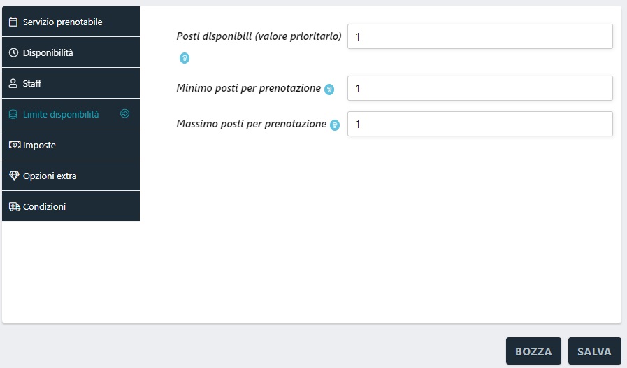 La scheda Limite Disponibilità serve per limitare i posti disponibili di default al servizio e per regolare il numero di posti prenotabili per singola transazione.