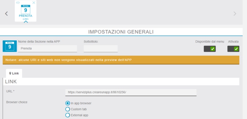 Si potrà quindi copiare la URL dalla barra di ricerca del browser e inserirla in APP tramite una sezione Link o un pulsante Link del modulo Multifunzione.