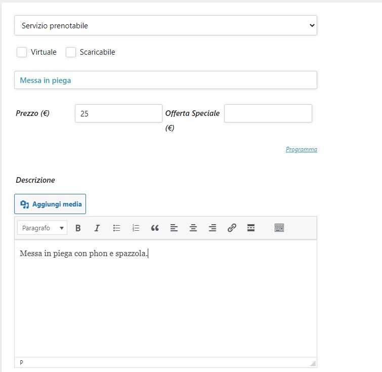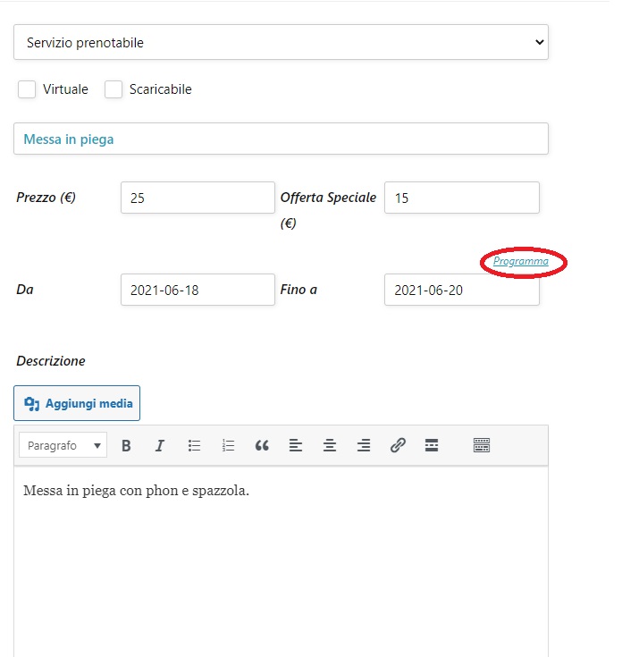 Spostandosi in fondo alla pagina, sotto al campo relativo alla descrizione del prodotto, c’è la sezione dei menù di funzione che serviranno per impostare i dettagli e la disponibilità del servizio.
