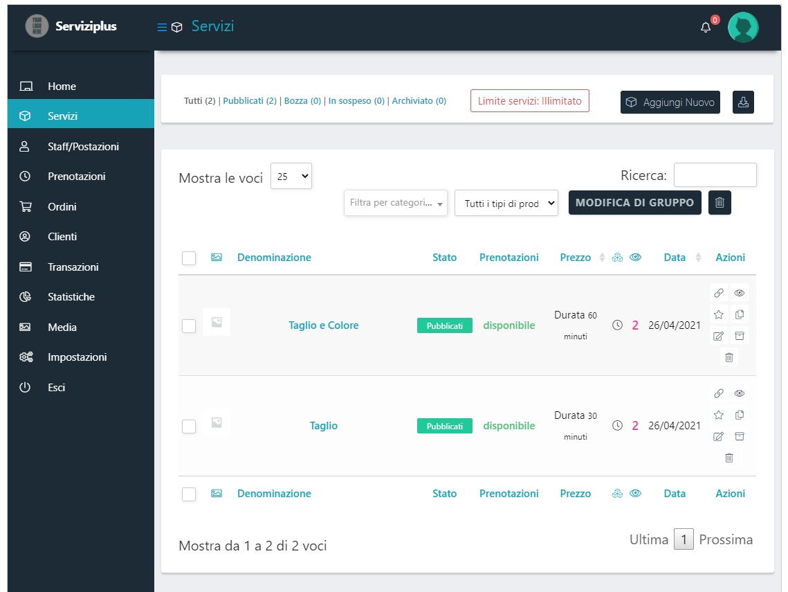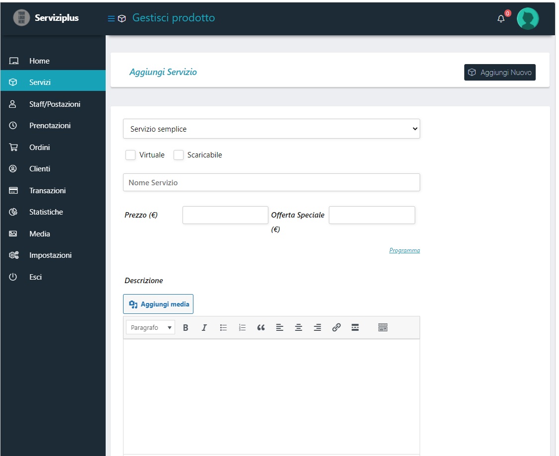 Da questa scheda si potranno visualizzare, cancellare, duplicare e modificare i servizi già presenti. Cliccando sul pulsante Aggiungi Nuovo in alto a destra, si aprirà una nuova pagina dove impostare un nuovo servizio da zero.