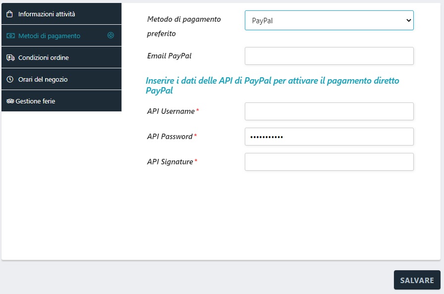 Dalla scheda Metodi di Pagamento si possono impostare i metodi di pagamento: in questo momento sono disponibili PayPal e Bonifico Bancario.