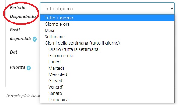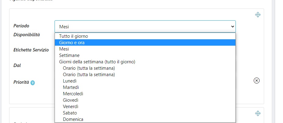 Il campo Periodo Disponibilità offre una larga gamma di condizioni tra le quali selezionare per rifinire nel dettaglio gli orari dei singoli operatori da associare ai servizi prenotabili, ciascuna di queste con campi personalizzati da compilare.