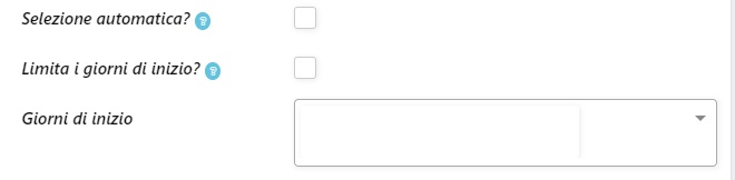 La casella accanto a Limita i giorni di inizio, va spuntata se si vuole limitare gli appuntamenti in modo da farli iniziare in determinati giorni della settimana. In caso di spunta, si dovranno aggiungere, dal menù a tendina sottostante (Giorni di inizio) i giorni indicati in cui far iniziare le prenotazioni.