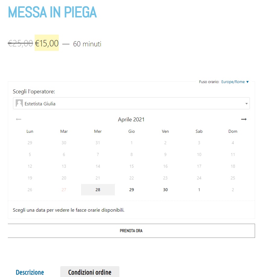 L’esempio sotto mostra come viene visualizzata la pagina di prenotazione del servizio di Messa in piega.