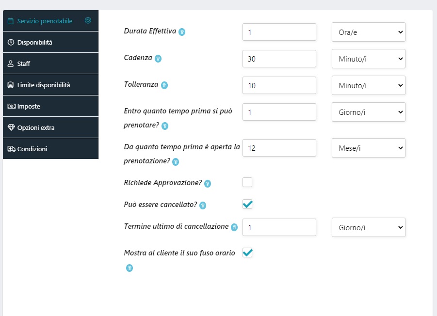 Va tenuto presente che se non si imposta nulla in questa scheda e si associano degli operatori dalla scheda Staff, la disponibilità del servizio sarà calcolata in base alla disponibilità degli operatori impostati in precedenza.