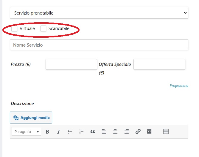 L’opzione Virtuale e Scaricabile aggiungono un ulteriore menù di impostazione; questi box vengono attivati per trasformare il servizio acquistato in un servizio Online con possibilità di inviare dei documenti scaricabili al cliente. Si potranno caricare dei file e il cliente, all’acquisto del servizio, otterrà la possibilità di scaricare quei documenti. Questa opzione è utile in caso di biglietti virtuali, prenotazioni turistiche o per vendita di beni e documenti online.