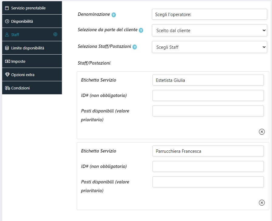 Se si utilizzano i membri dello Staff, la disponibilità del singolo operatore viene presa in considerazione unitamente alla disponibilità del servizio.