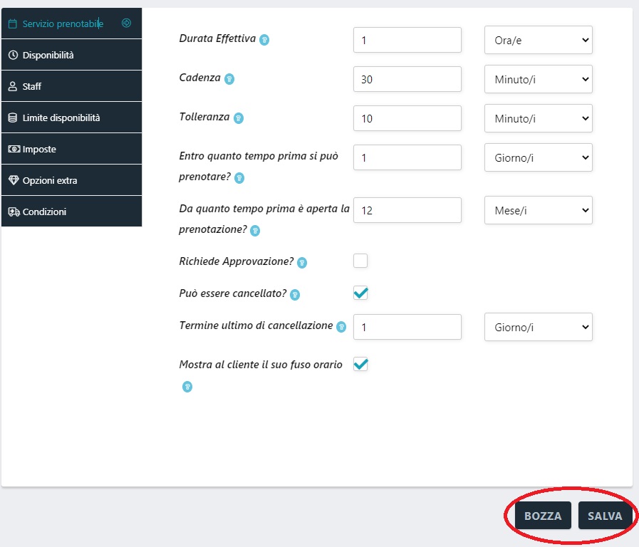 Dalla scheda Servizio Prenotabile sarà possibile indicare i dettagli del servizio.